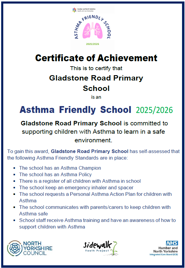 To gain this award, Gladstone Road Primary School has self-assessed that the following Asthma Friendly Standards are in place: